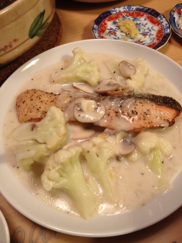 湯豆腐、シャケとカリフラワーホワイトソース、キノコ和え